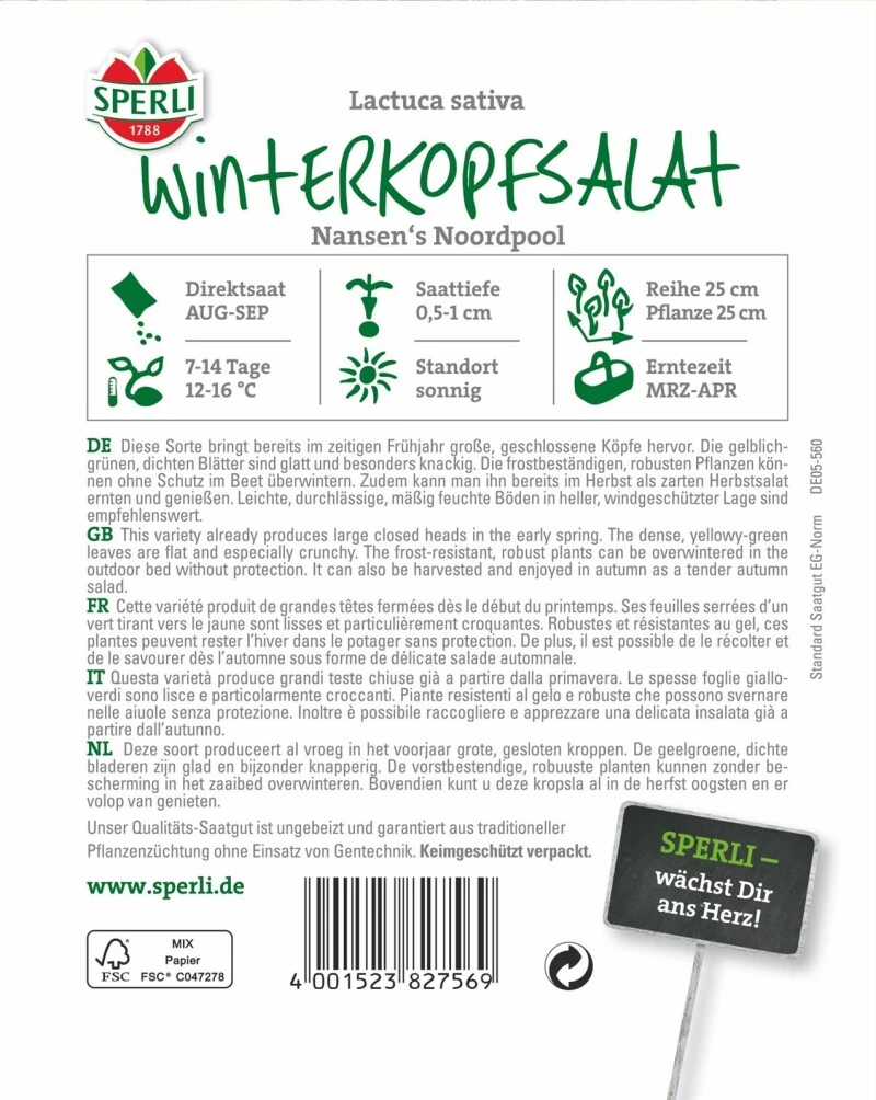 In der kalten Jahreszeit ist frischer Salat ein wichtiger Vitamin- und Mineralstofflieferant. Der Winterkopfsalat ‚Nansen’s Noordpool‘ ist eine frostbeständige Sorte mit großen, geschlossenen Köpfen, die für frühe Ernten besonders geeignet ist. An einem sonnigen, windgeschützten Platz mit leichter, durchlässiger und mäßig feuchter Erde kann ‚Nansen’s Noordpool‘ im August oder September ausgesät werden. Dort kann er ohne Schutz im Beet überwintern und ist im März und April reif für die Ernte. Aber auch im Herbst, kurz nach der Aussaat, ist eine Ernte für einen leckeren Herbstsalat schon möglich.