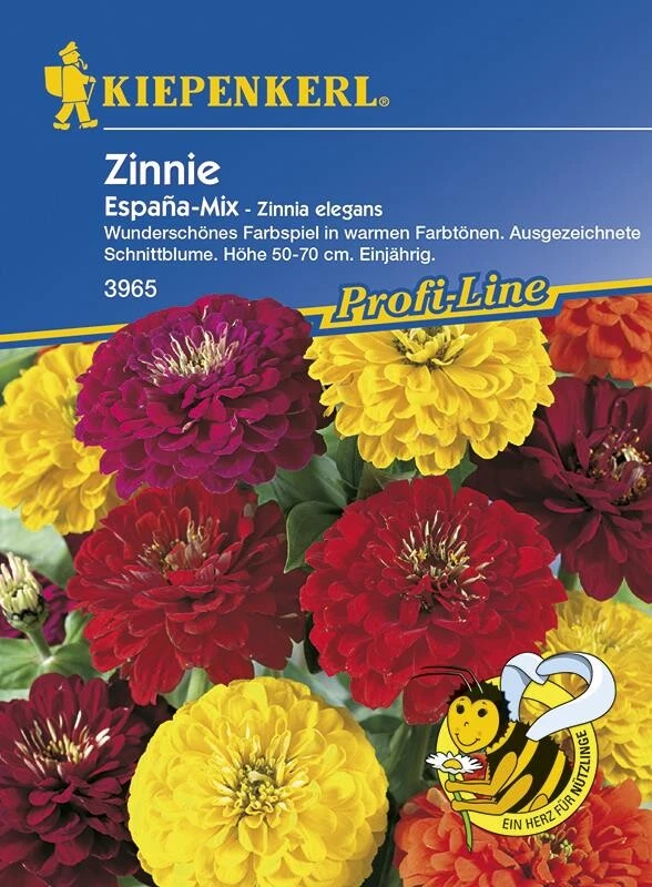 Espana-Mix‘ gefällt durch ein wunderschönes Farbspiel in warmen orange, gelb und rot. Diese Mischung ist besonders blühfreudig und steht auf straffen Stielen, die sich immer wieder verzweigen. Die Pflanzen sind viel robuster als frühere Sorten und entwickeln sich auch bei ungünstiger feuchter Witterung erstaunlich gut. Freundliche Farben erfreuen sehr lange von Juli bis Oktober. Ohne viel Pflege bieten diese Zinnien auf Beeten und Rabatten einen überwältigenden Anblick und bieten viele lange haltbare Schnittblumen für die Vase.