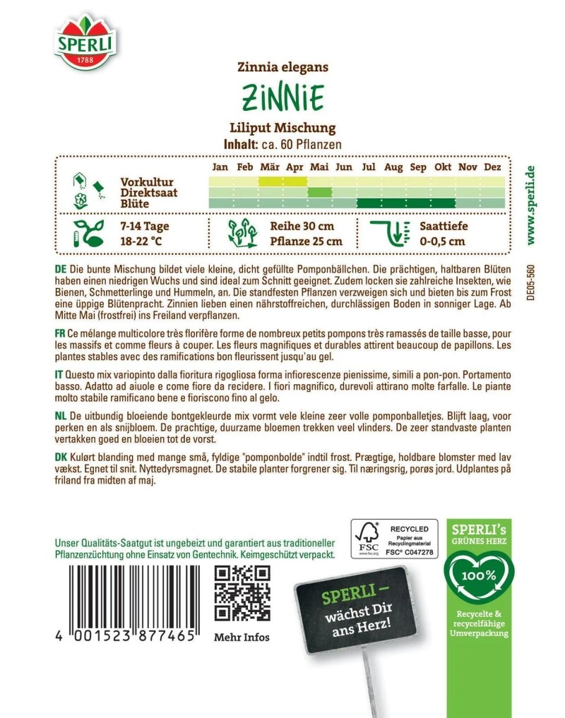 Liliput ist eine bunte Mischung aus einjährigen, niedrig bleibenden Zinnien. Sie lässt sich sehr vielseitig verwenden z. B. als Beet-, Balkon- oder Gruppenpflanze sowie als Schnittblume.