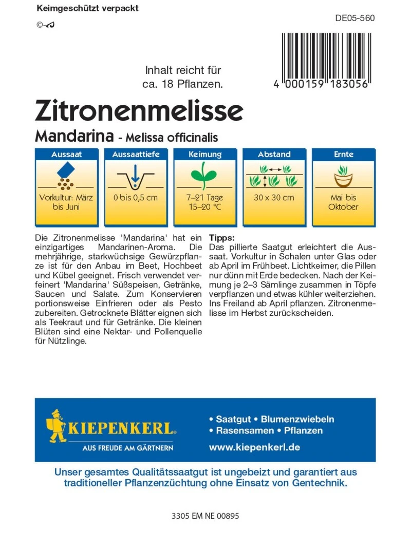 Die Zitronenmelisse ‚Mandarina‘ ist eine mehrjährige, starkwüchsige Gewürzpflanze mit einem zitronigen Aroma, duftet nach Mandarinen. Die frischen jungen Blätter vor der Blüte ernten und frisch für Salate, Soßen, Süßspeisen oder getrocknet für Teemischungen verwenden. Sie wächst buschig verzweigt und verträgt einen starken Rückschnitt.