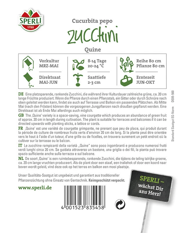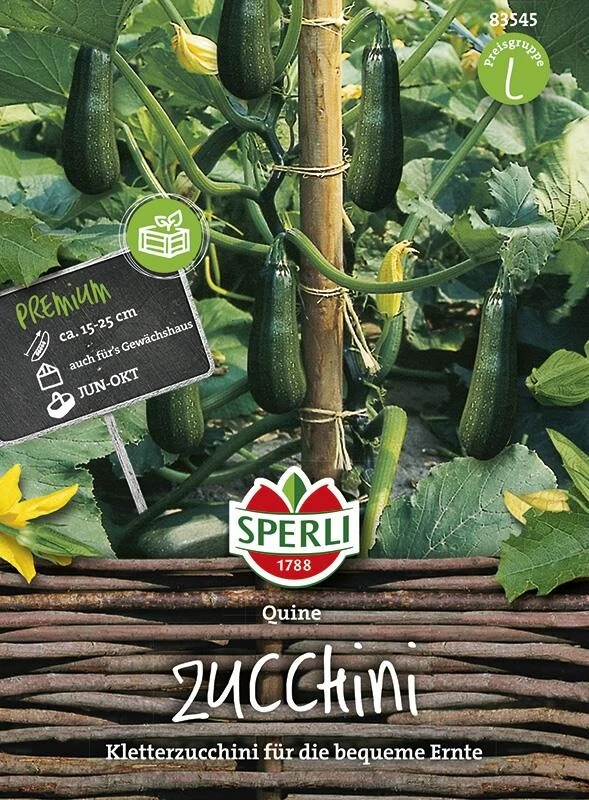Platzsparend und rankend ist die Zucchini ‚Quine‘, die während ihrer Kulturdauer zahlreiche grüne, ca. 20 cm lange Früchte produziert. Wenn Du der Pflanze einen Pflanzstab, ein Gitter oder Schnüre als Hilfe zur Verfügung stellst, kann sie nach oben geleitet werden und findet damit auch auf der Terrasse oder dem Balkon ein passendes Plätzchen. Ab Mitte Mai können die vorgezogenen Jungpflanzen dieser F1-Sorte nach draußen versetzt werden. Eine Direktsaat ist ab Ende Mai auch möglich. Dieses schmackhafte, knackige Gemüse schmeckt frisch als Rohkost hervorragend, kann aber auch zum Grillen und Kochen verwendet werden.