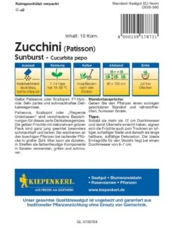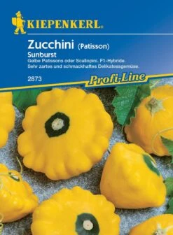 Als Patissons, Scallopini oder auch „Fliegende Untertassen“ bekannt ist die Zucchini ‚Sunburst‘. Die verschiedenen Bezeichnungen für dieses zarte Delikatessgemüse ergeben sich sicherlich auch aus der besonderen Form der Früchte. Die gelben Zucchini aus der Profi-Line haben einen dekorativen grünen Fleck am Ansatz und sind, wenn Sie sie in sehr jungem Stadium ernten, besonders schmackhaft und lecker. Die ‚Sunburst‘ erscheint an den buschigen Pflanzen bei laufender Ernte in großer Zahl. Sie kann gedünstet, in Streifen als farbenfreudige Komponente in Salaten verwendet, gegrillt und geschmort werden. Die Ernte dieser F1-Hybride findet von Juli bis Oktober statt.