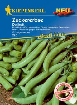 Die unter Feinschmeckern beliebte Zuckererbse ‚Delikett‘ begeistert mit dickfleischigen Hülsen. Diese schmecken zuckersüß und weisen eine besondere Bissfestigkeit auf, wodurch sie schön knackig sind. Bei einer frühen Ernte entwickeln sie noch keine Fäden. Die Erbsenkörner sind bei der Ernte angenehm weich und saftig. Die geernteten Hülsen sind ideal zum Einfrieren geeignet. Somit können sie auch zu einem späteren Zeitpunkt genossen werden. Die Pflanzen dieser Profi-Line-Erbsensorte wachsen bis 90 cm hoch und sind resistent gegen Echten Mehltau. Durch den kompakten Wuchs kann ‚Delikett‘ problemlos auch im Kübel oder Hochbeet angebaut werden.