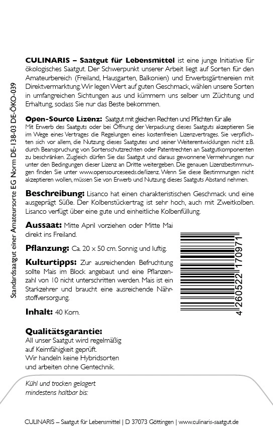 Lisanco weist einen mittelfrühen bis frühen Ertebeginn (85-100 Tage) und einen langgezogenen Ernteverlauf auf. Die Sorte hat einen charakteristischen Geschmack und eine ausgeprägt Süße. Der Kolbenstückertrag ist sehr hoch, auch mit Zweitkolben. Sowohl die Kolbengröße als auch der Gesamtkiloertrag liegen im mittleren Bereich üblicher Populationssorten. Lisanco verfügt über eine gute und einheitliche Kolbenfüllung. Es ist zu empfehlen, bei Lisanco grundsätzlich Trichogramma-Schlupfwespen zur Vorbeugung von Maiszünslerbefall einzusetzen. Gezüchtet wurde Lisanco von Dr. Spieß auf dem Dottenfelderhof. Die Sorte wurde im April 2018 vom BSA zugelassen. Das Saatgut von Lisanco untersteht der Open-Source-Lizenz und darf bei ihrer Nutzung und Weiterentwicklung nicht durch Sortenschutz- oder Patentrechte eingeschränkt werden.