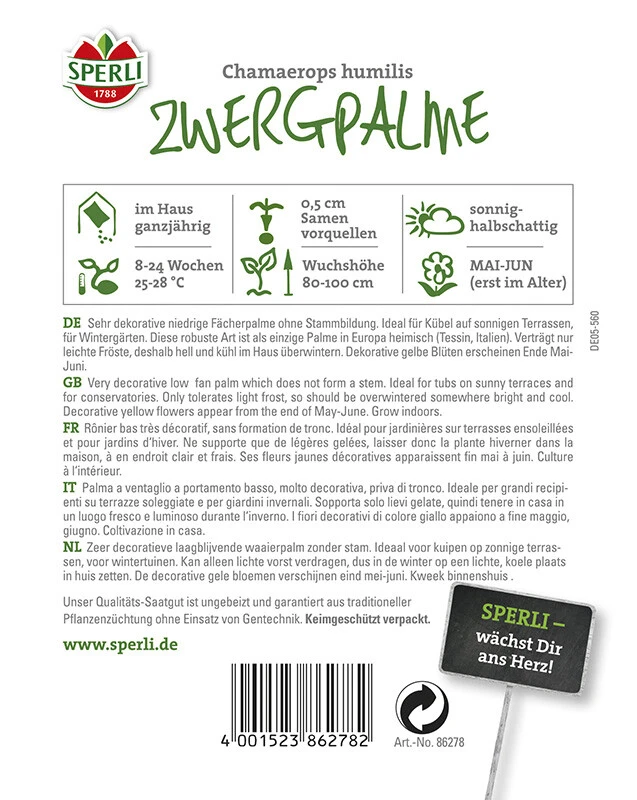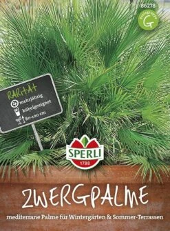 Die einzige in Europa heimische Palme aus dem Mittelmeerraum, sehr widerstandsfähig. Im Weinbauklima und besonders geschützten Lagen bedingt winterhart, verträgt einige Grade Frost.