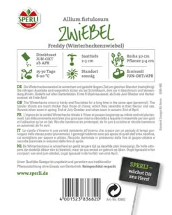 Die Zwiebel ‚Freddy‘ ist eine mehrjährige, frostharte Winterheckenzwiebel. Am selben Standort kann diese Sorte viele Jahre alt werden. Je nach Belieben und Reifestadium können sowohl die weißen Zwiebeln als auch das Laub geerntet werden. Letzteres ist grün, röhrenförmig und wesentlich dicker und höher als beim Schnittlauch, hat aber ähnlich wie dieser einen mild-würzigen Geschmack. An einem sonnigen Plätzchen können die Zwiebelsamen als Frühjahrsaussaat im April und als Herbstaussaat von Juni bis Oktober ausgebracht werden. ‚Freddy‘ stellt keine gehobenen Ansprüche und wächst auf allen Gartenböden zuverlässig und ertragreich.