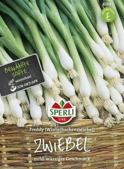Die Zwiebel ‚Freddy‘ ist eine mehrjährige, frostharte Winterheckenzwiebel. Am selben Standort kann diese Sorte viele Jahre alt werden. Je nach Belieben und Reifestadium können sowohl die weißen Zwiebeln als auch das Laub geerntet werden. Letzteres ist grün, röhrenförmig und wesentlich dicker und höher als beim Schnittlauch, hat aber ähnlich wie dieser einen mild-würzigen Geschmack. An einem sonnigen Plätzchen können die Zwiebelsamen als Frühjahrsaussaat im April und als Herbstaussaat von Juni bis Oktober ausgebracht werden. ‚Freddy‘ stellt keine gehobenen Ansprüche und wächst auf allen Gartenböden zuverlässig und ertragreich.